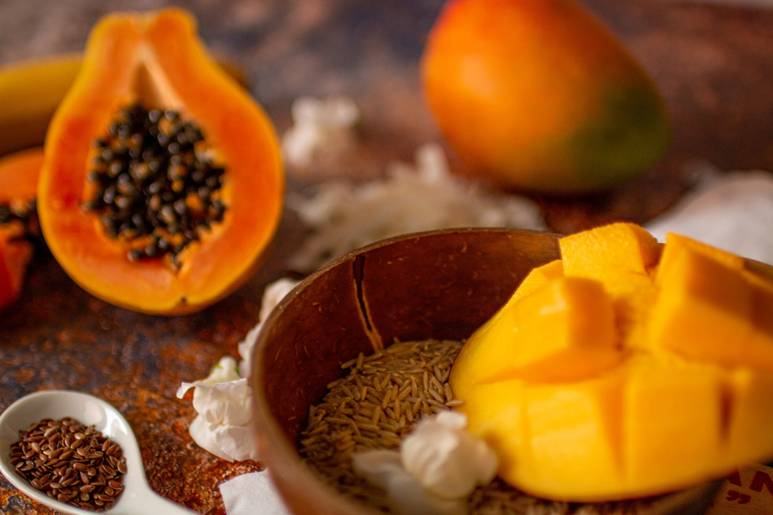 Papaya is rich in protein, calories, carbohydrates, fiber, vitamin A, C, B9, B1, B5, B3, E, potassium, and lycopene.